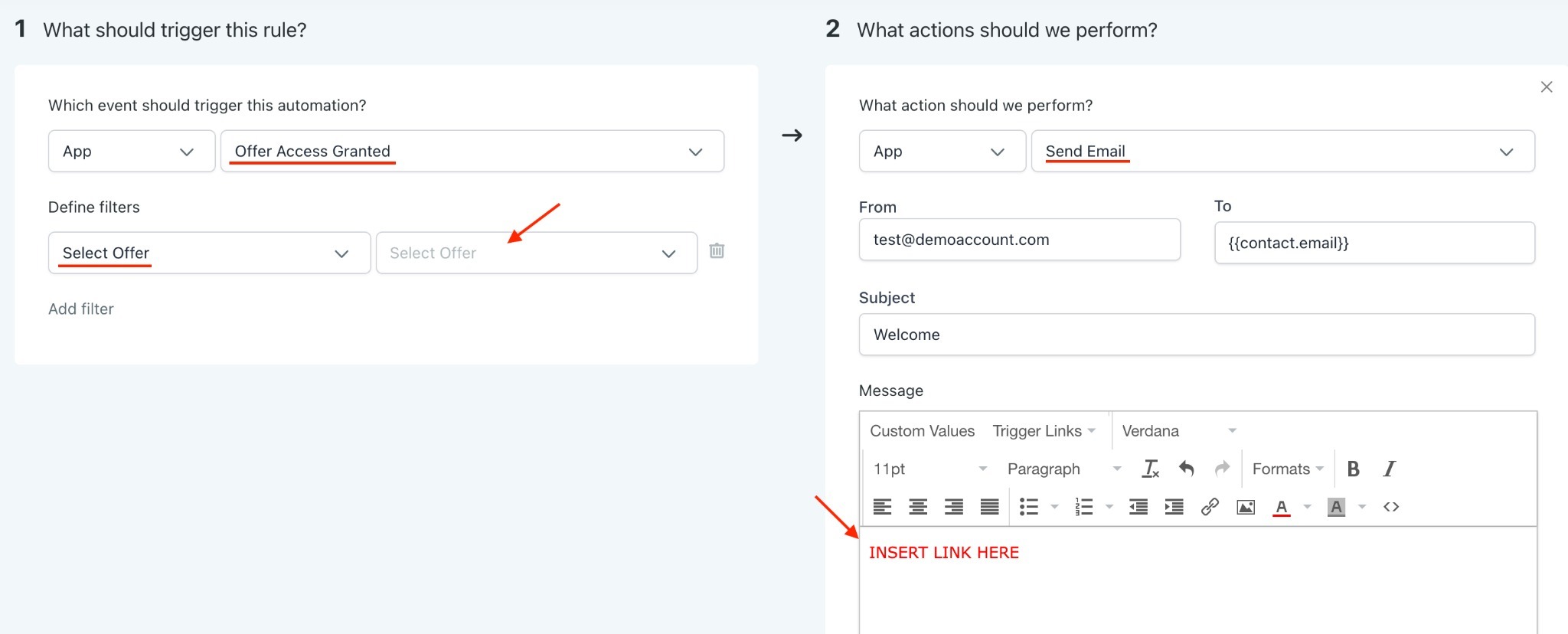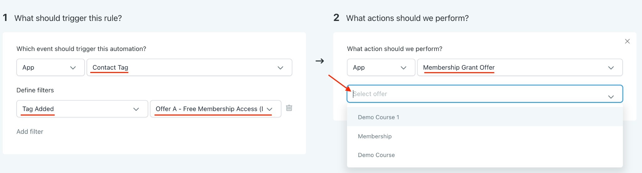 NOTE: Membership New Signup signifies an action was done by the contact– they filled out a form, made a purchase, etc. while Offer Access Granted implies an action done by YOU giving them permission to access the offer.